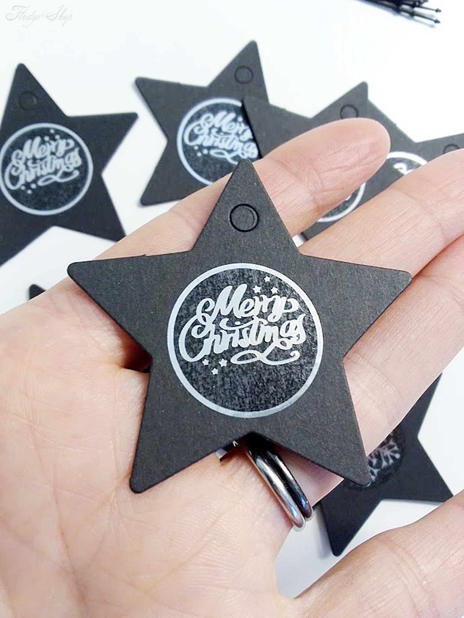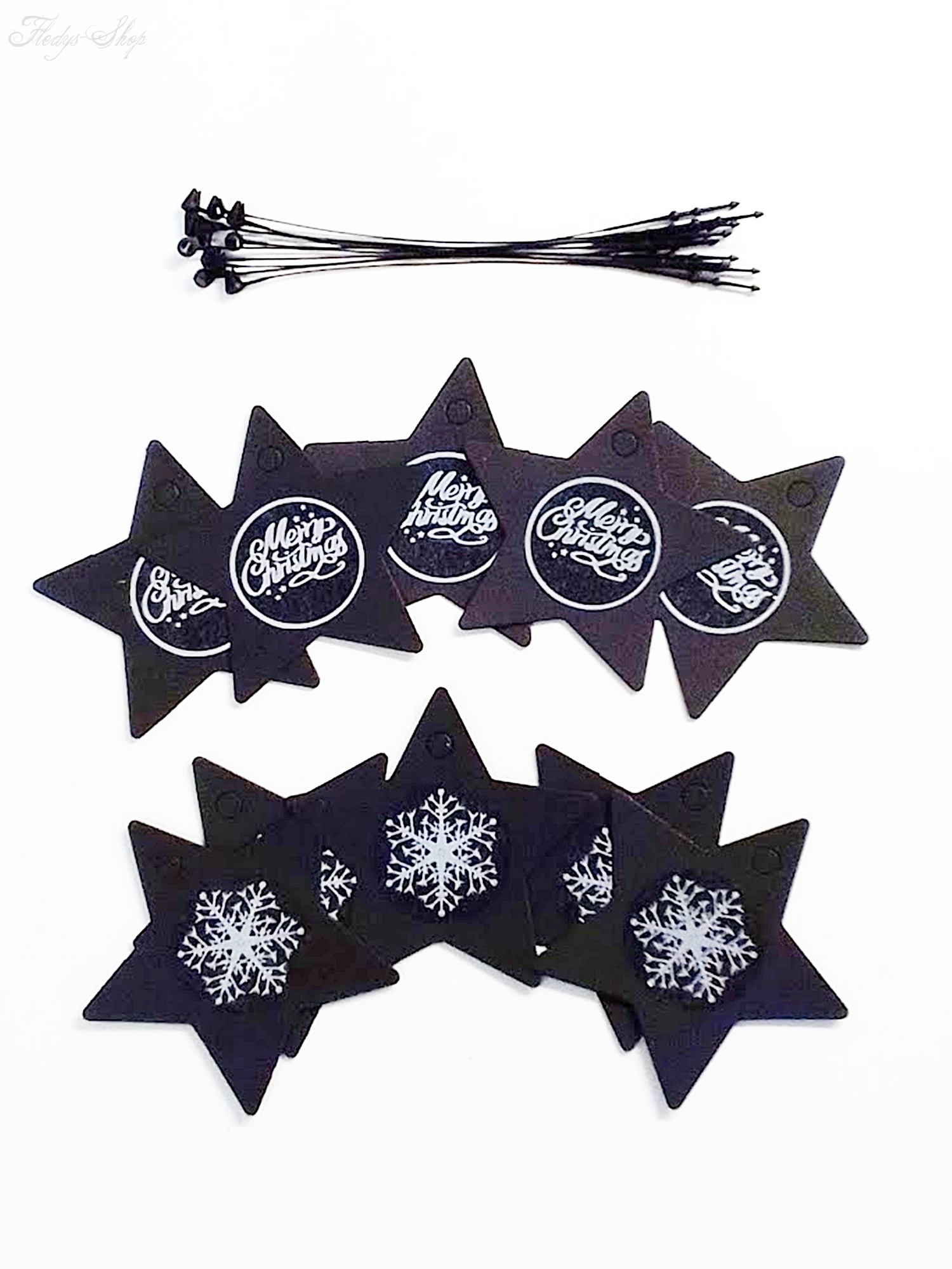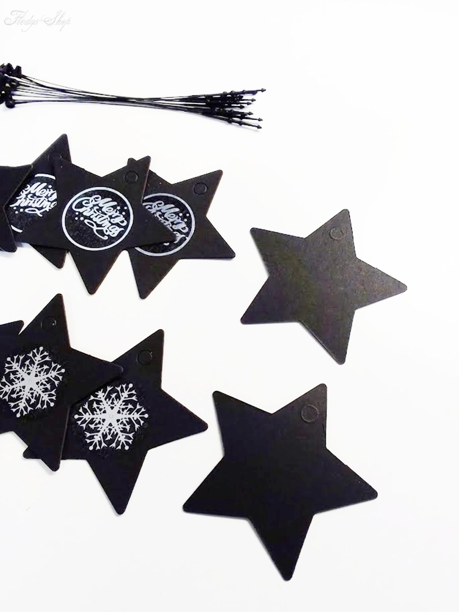 10 Geschenkanhänger in Sternform, davon sind 5 Stück mit der Beschriftung „Merry Christmas“ und 5 Stück mit einer Schneeflocke. Das Geschenkanhänger Stern Set ist in 2 Varianten auswählbar. Zu jedem Geschenkanhänger gehört ein schwarzer Kunststofffaden mit Sicherheitsverschluss, sodass dieser am Geschenk schnell befestigt werden kann. Zum Beschriften eignet sich hier ein Silber- oder Weißmarker.