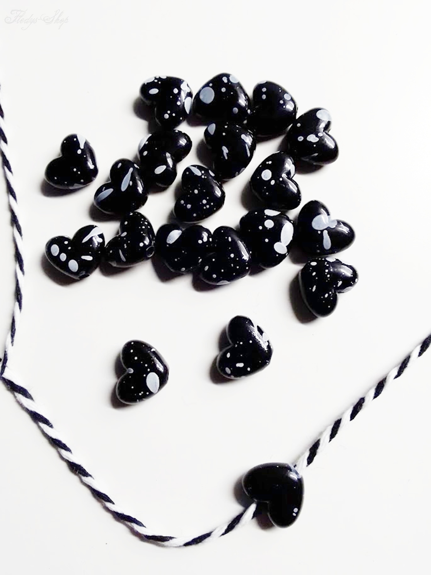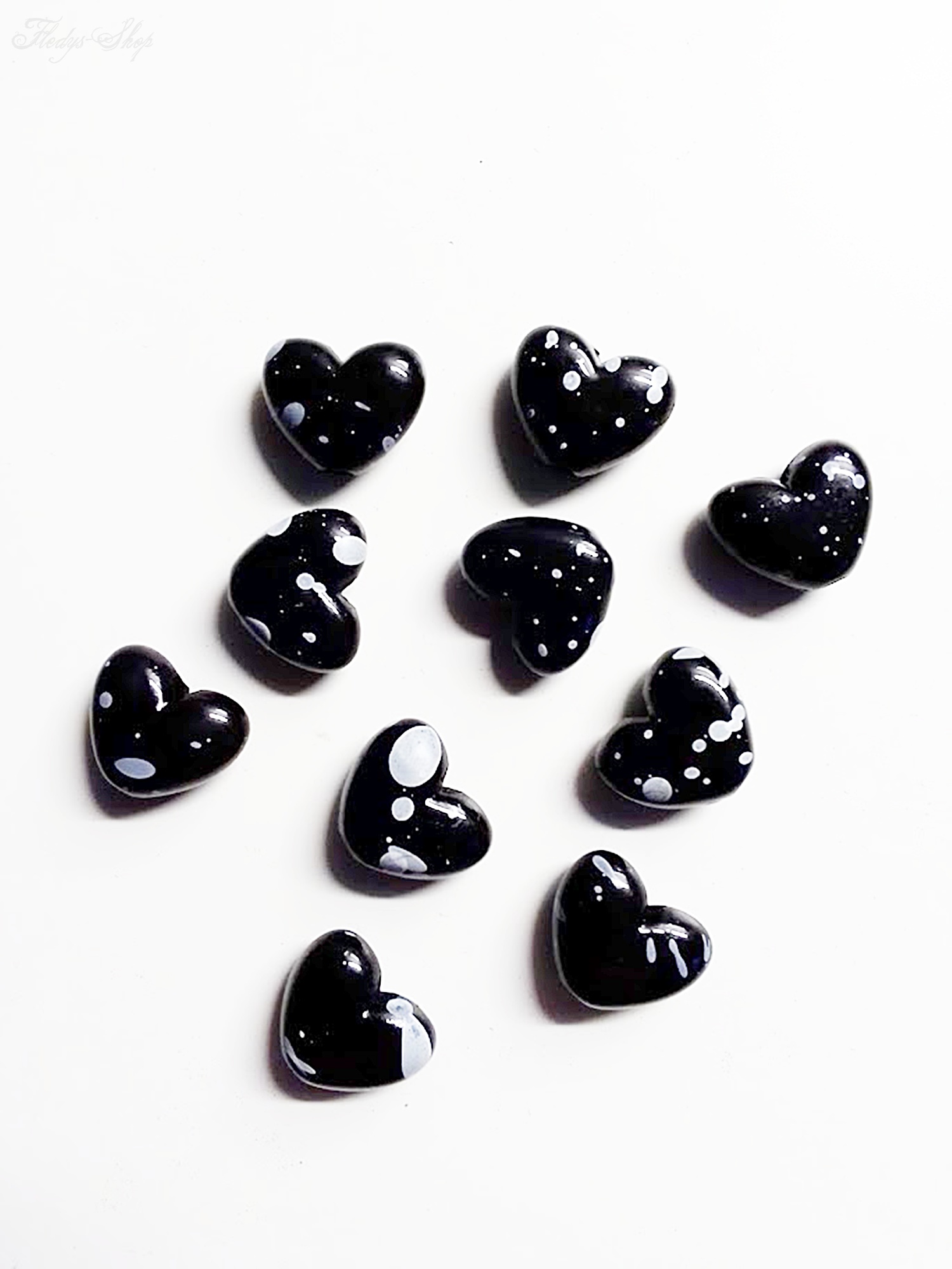 10 kleine schwarze Herz-Perlen mit Farbklecksen sind wunderbar geeignet zum Dekorieren, als Bastelmaterial und in der Schmuckherstellung. Sie lassen sich auch auf Hüte und auf Bekleidung nähen.