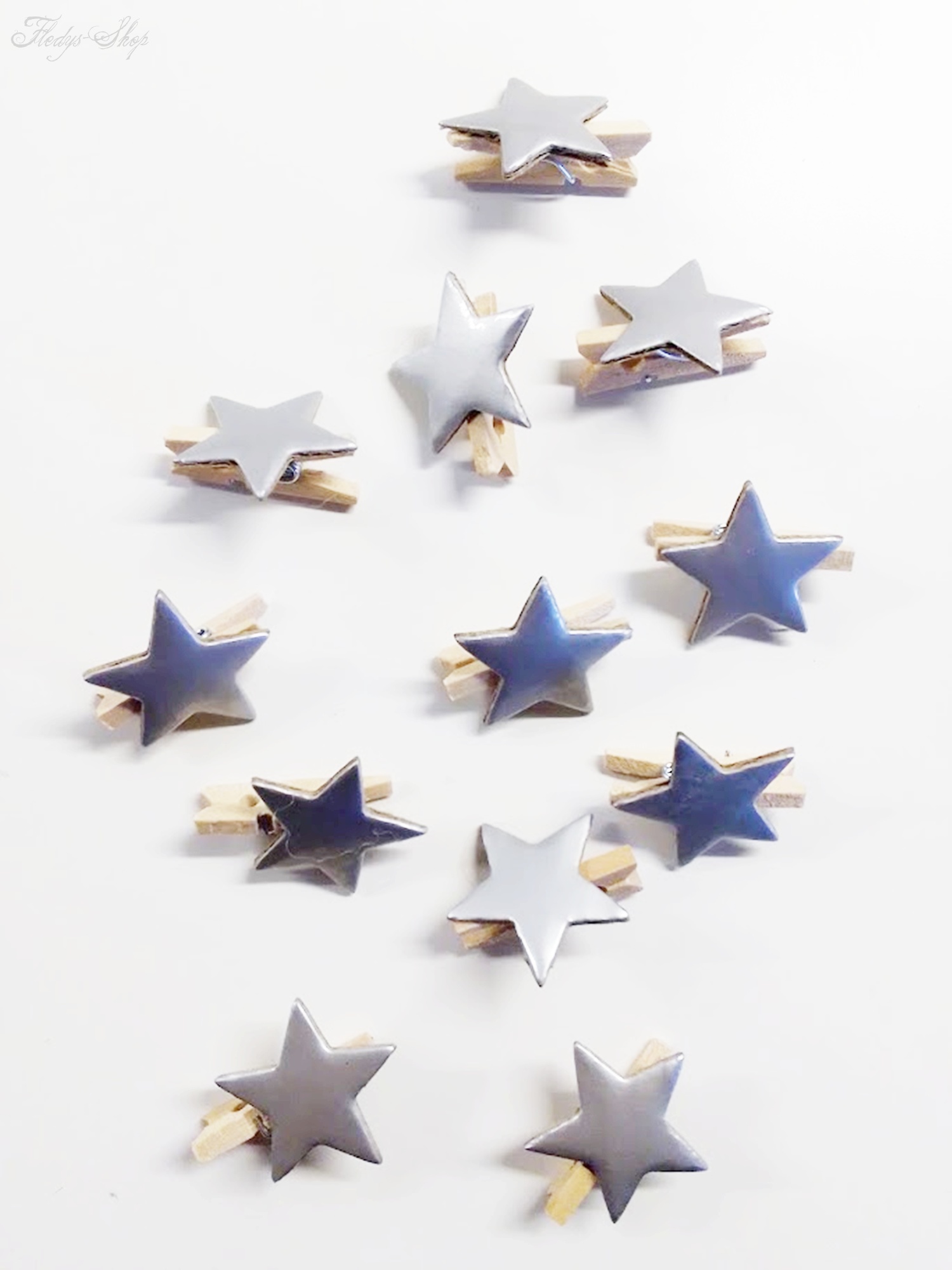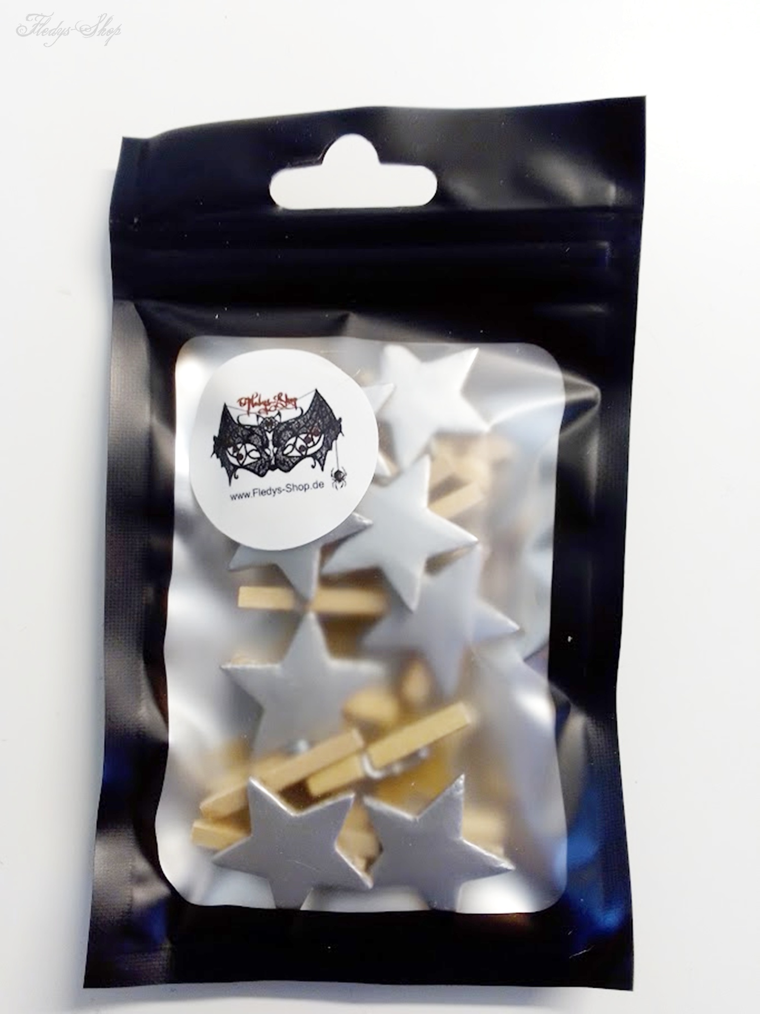 12 stabile Holzklammern mit einem silbernen Stern bestückt. Ideal zur Verwendung als Gastgeschenk, zum Anklipsen von Weihnachtskarten oder zum Dekorieren von Adventskalendern und vieles mehr.