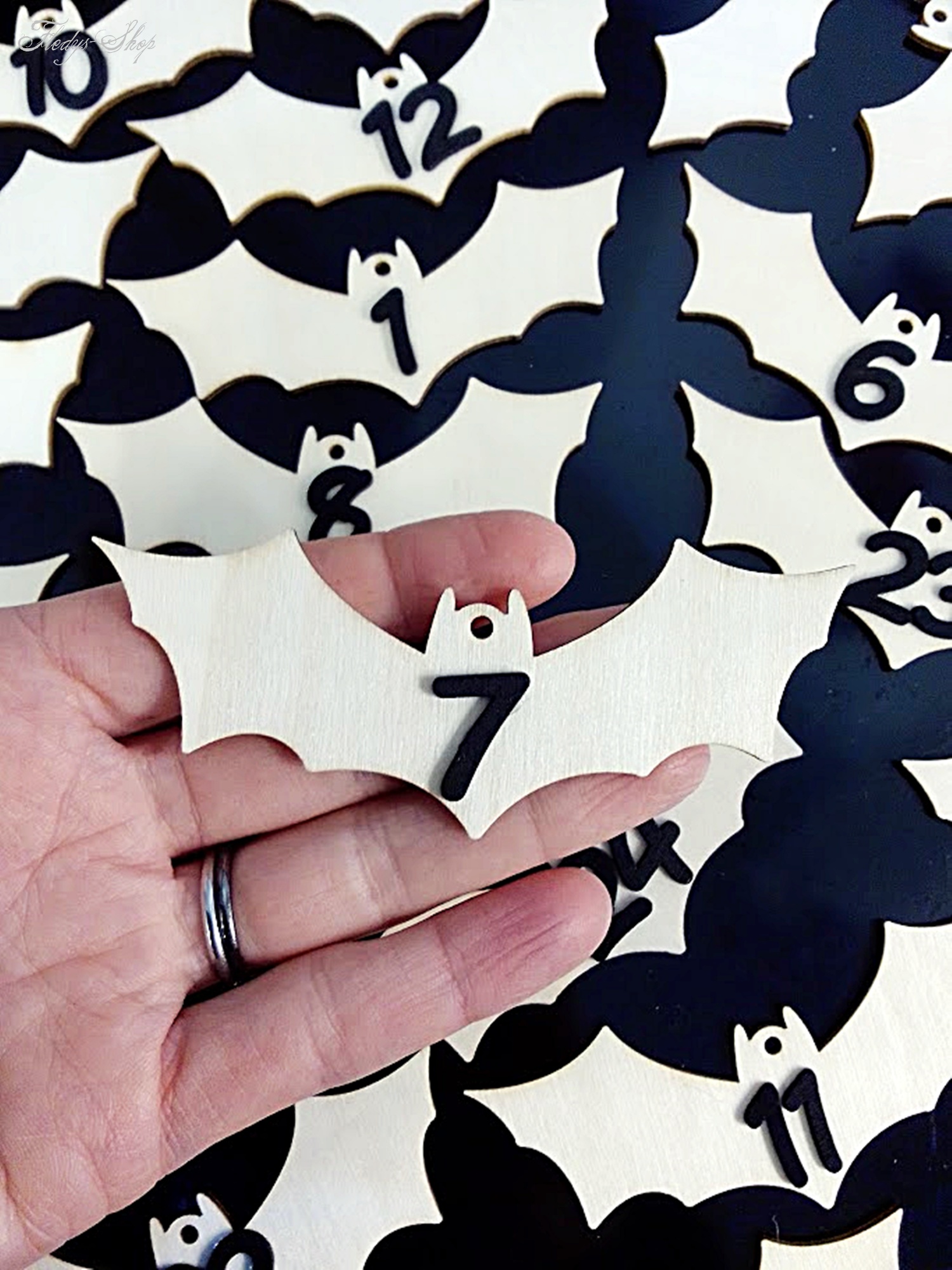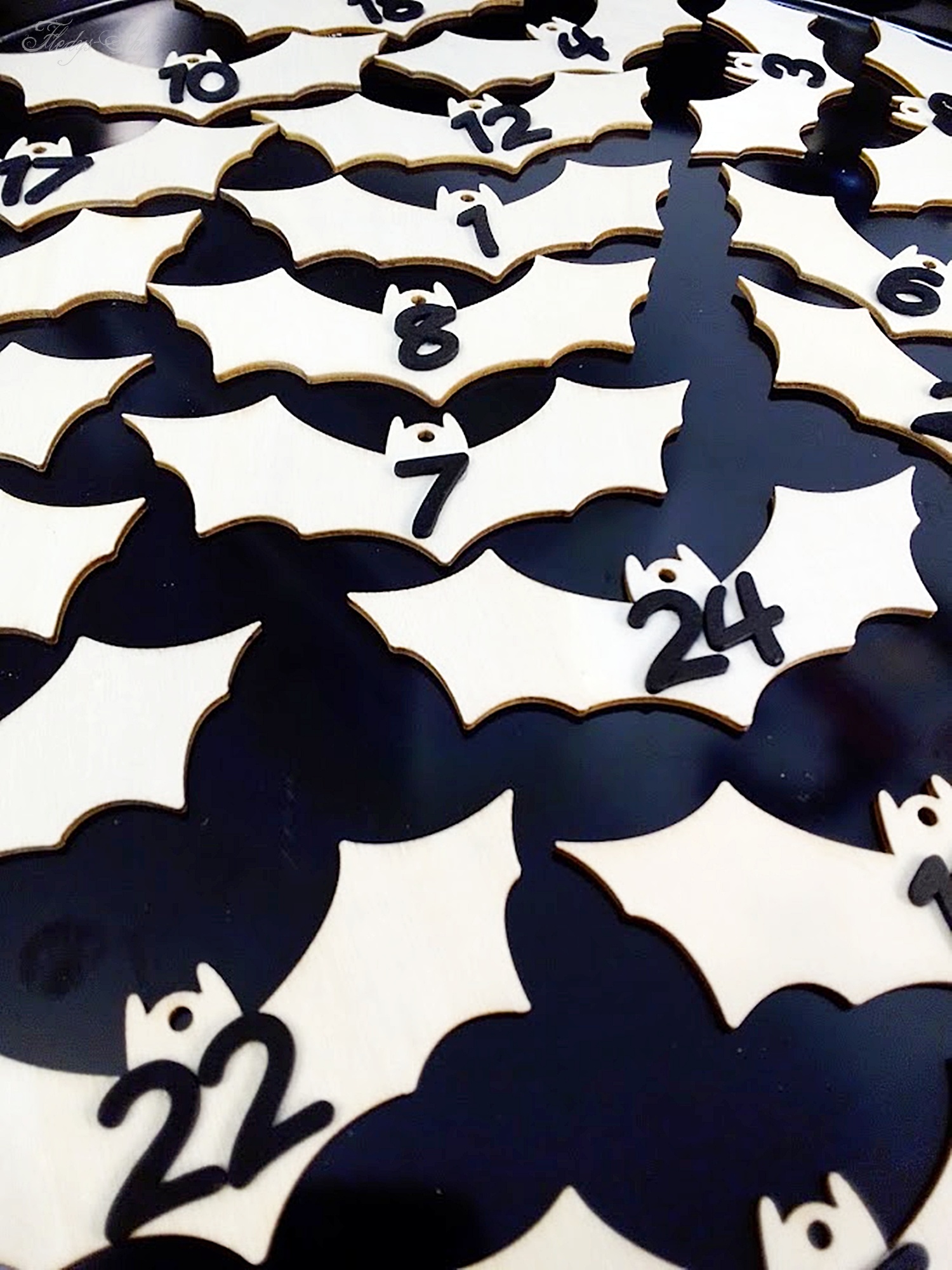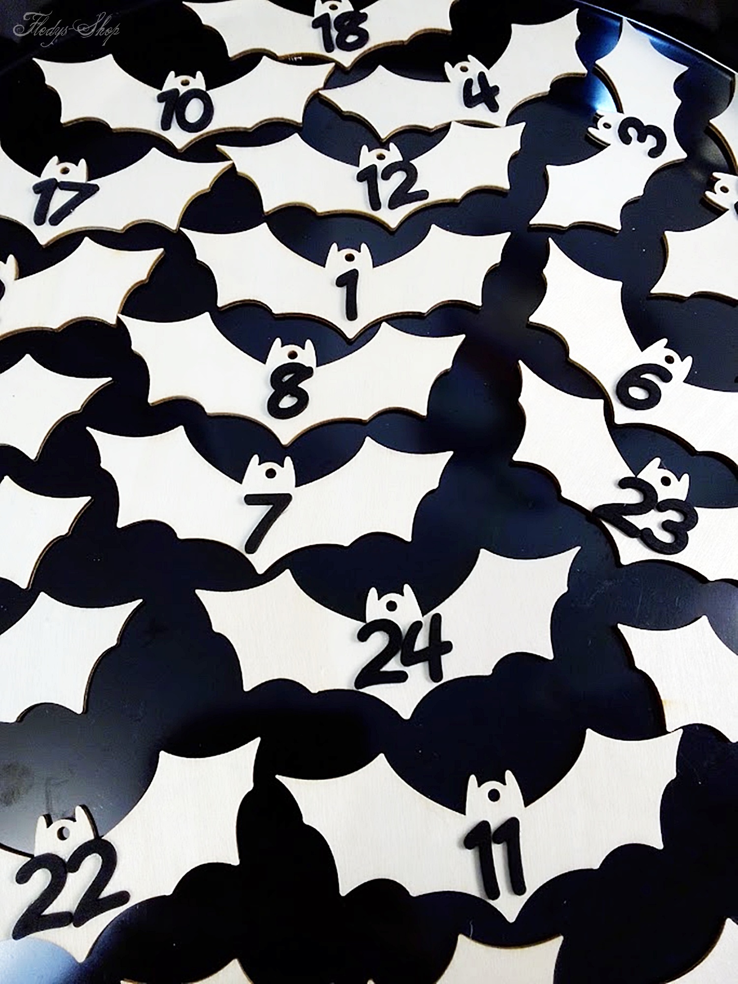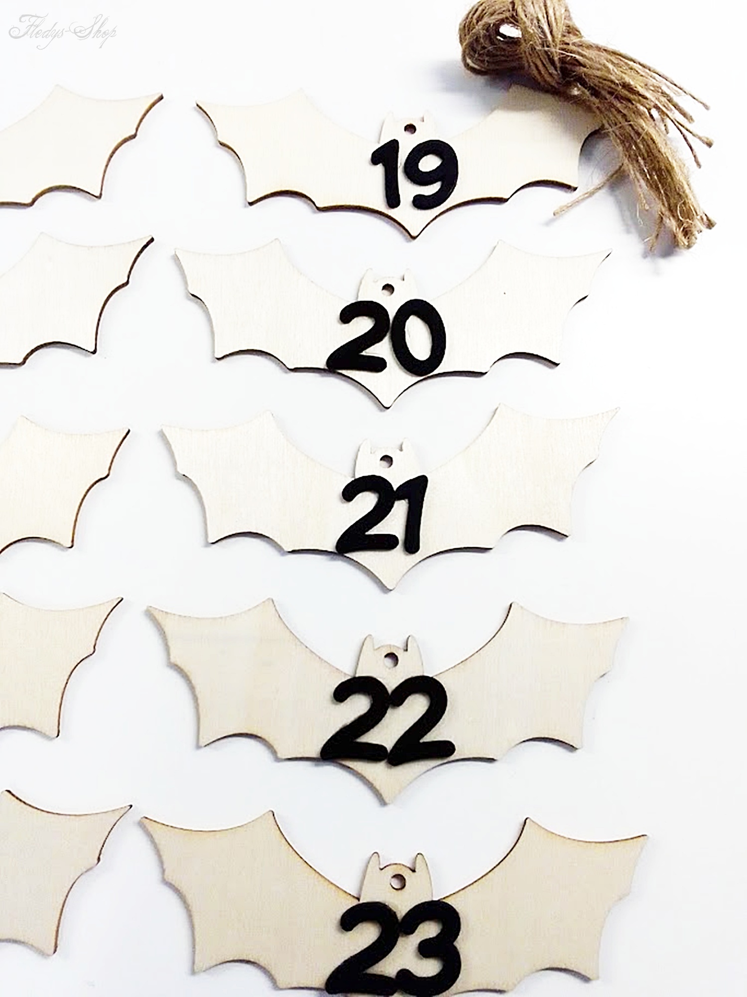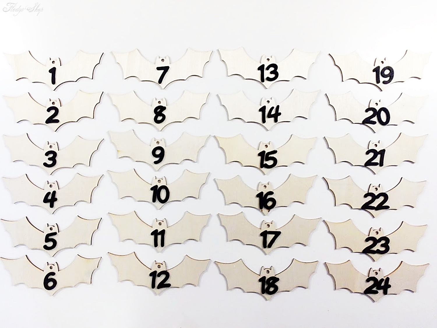 24 Holzfledermäuse mit schwarzen Holzzahlen für den Adventskalender. Zu der jeweiligen Holzfledermaus gehört eine Juteschnur. Somit kann das Schmücken mit diesen Holzfledermäusen mit schwarzen Zahlen von Säckchen oder kleinen Kistchen für den Adventskalender beginnen.
