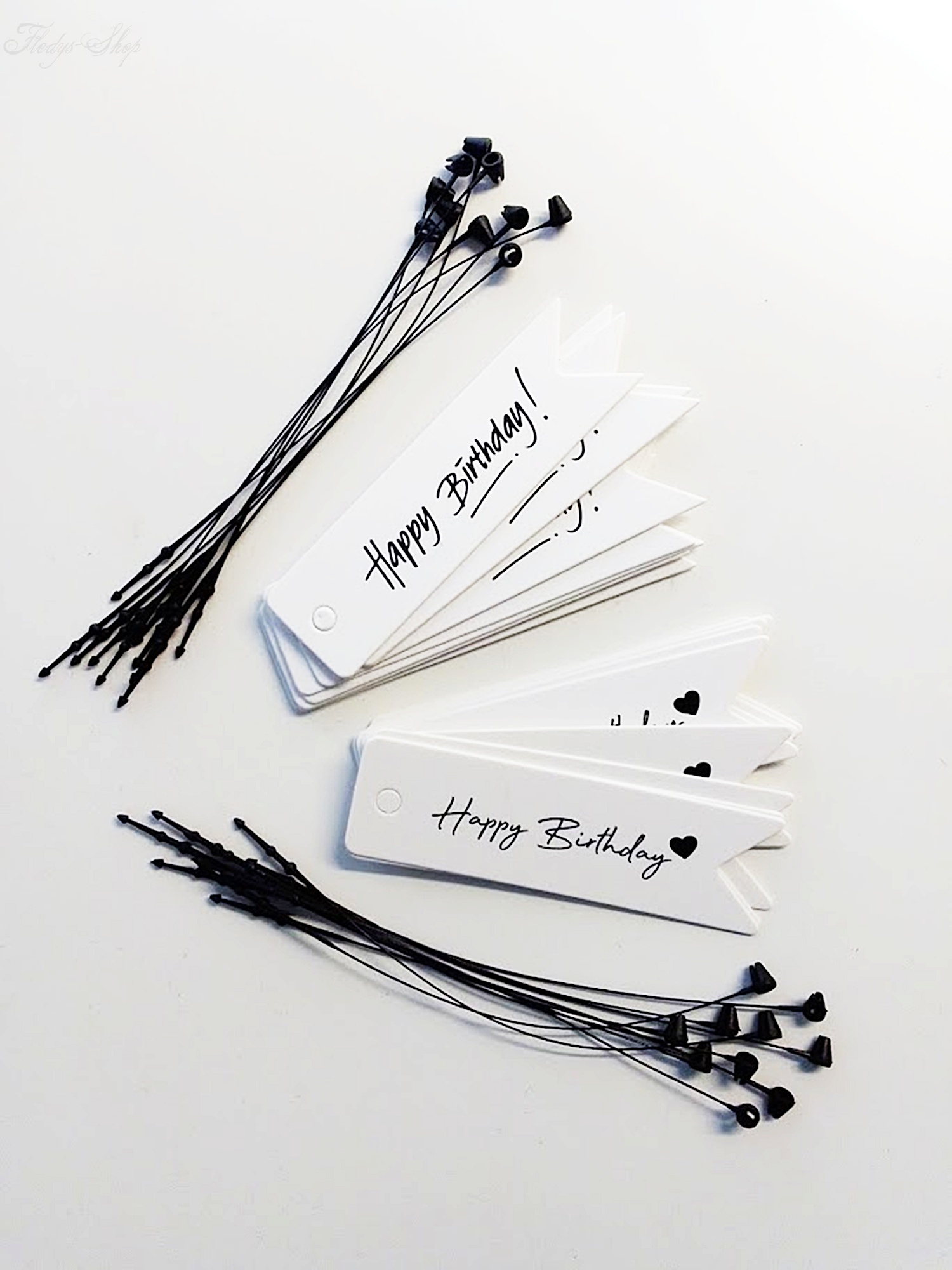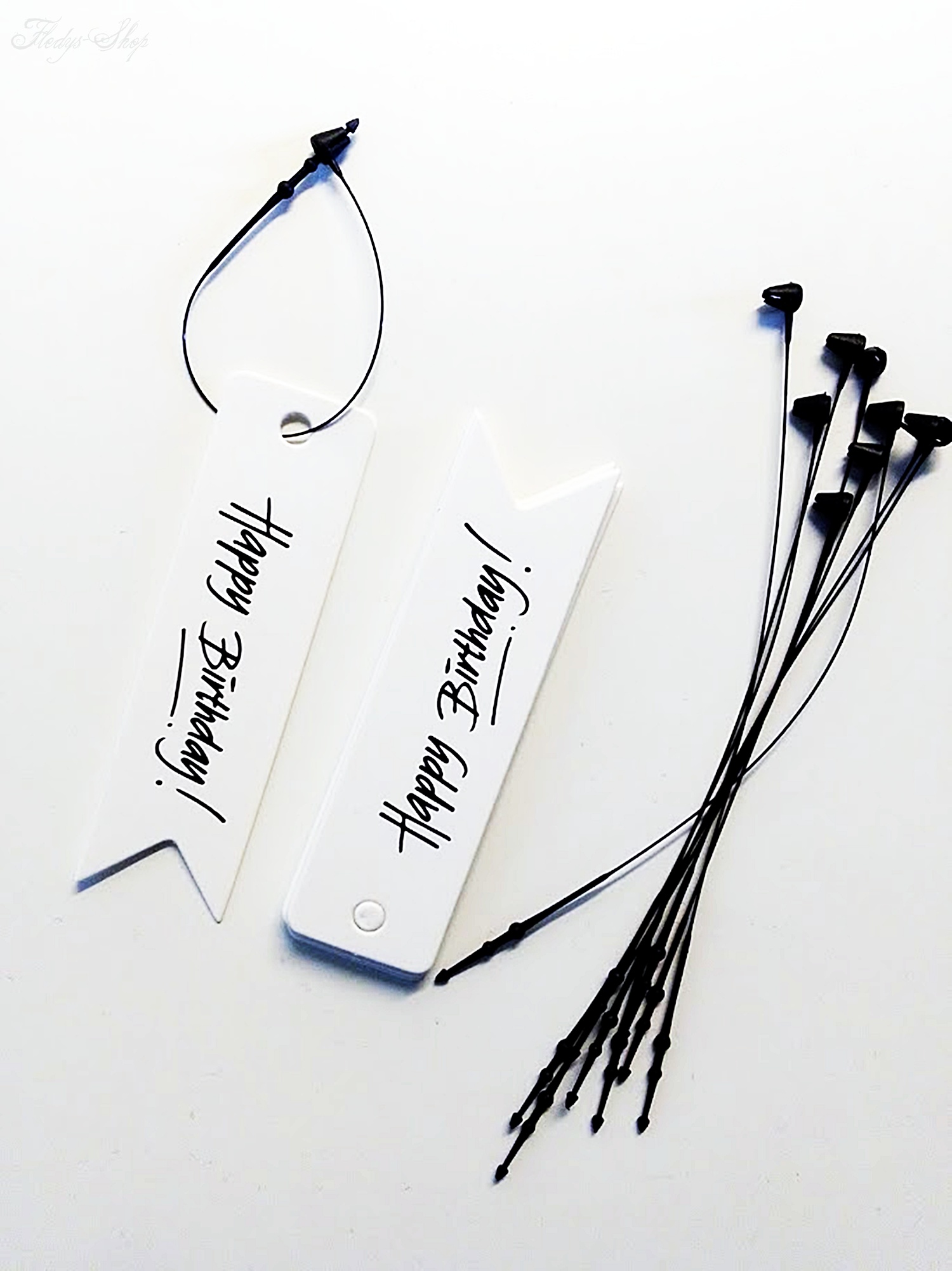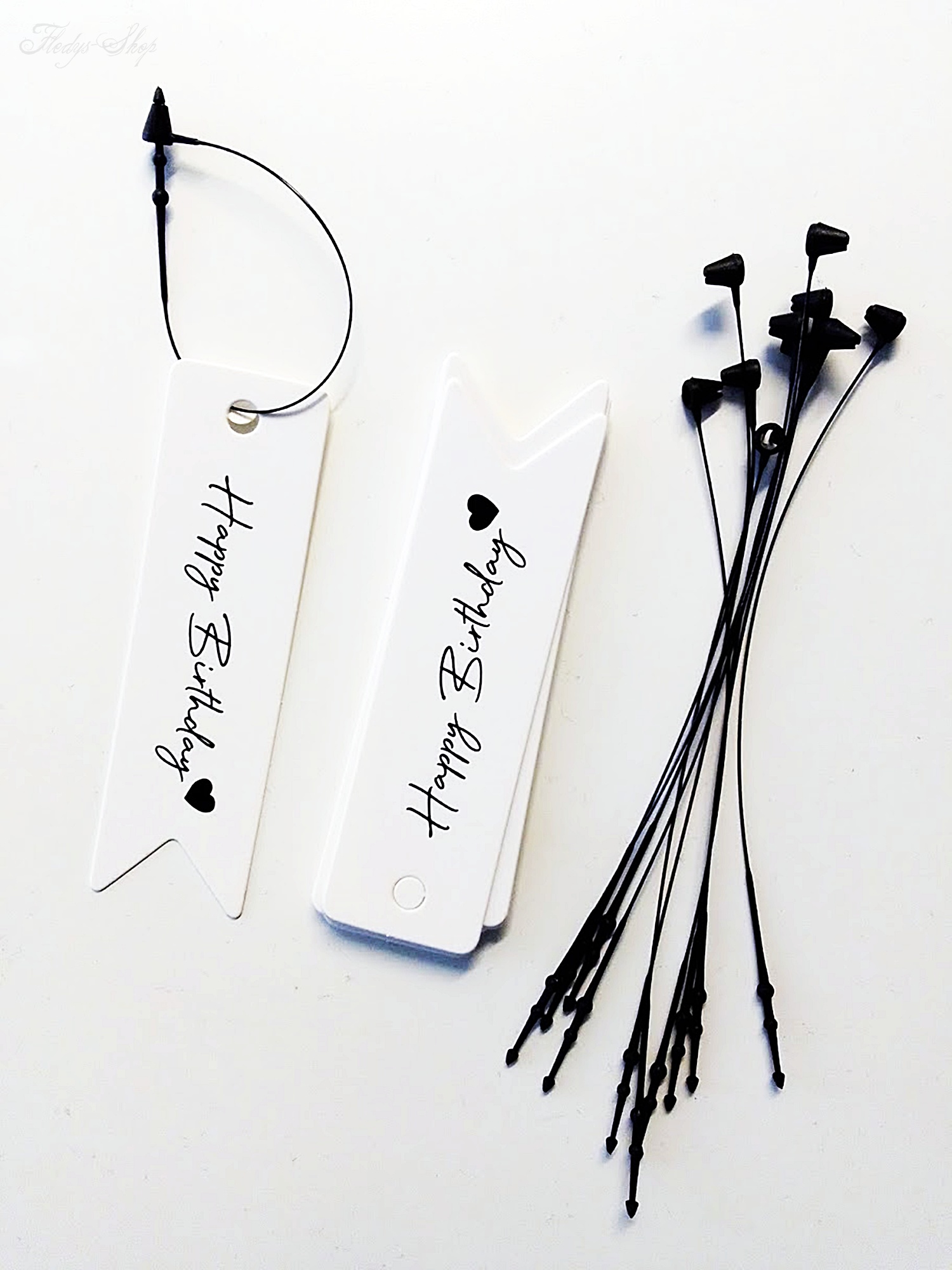 10 Geschenkanhänger in 2 Varianten wählbar mit der Beschriftung „Happy Birthday“. Zu jedem Geschenkanhänger gehört ein schwarzer Kunststofffaden mit Sicherheitsverschluss, sodass dieser am Geschenk schnell befestigt werden kann.