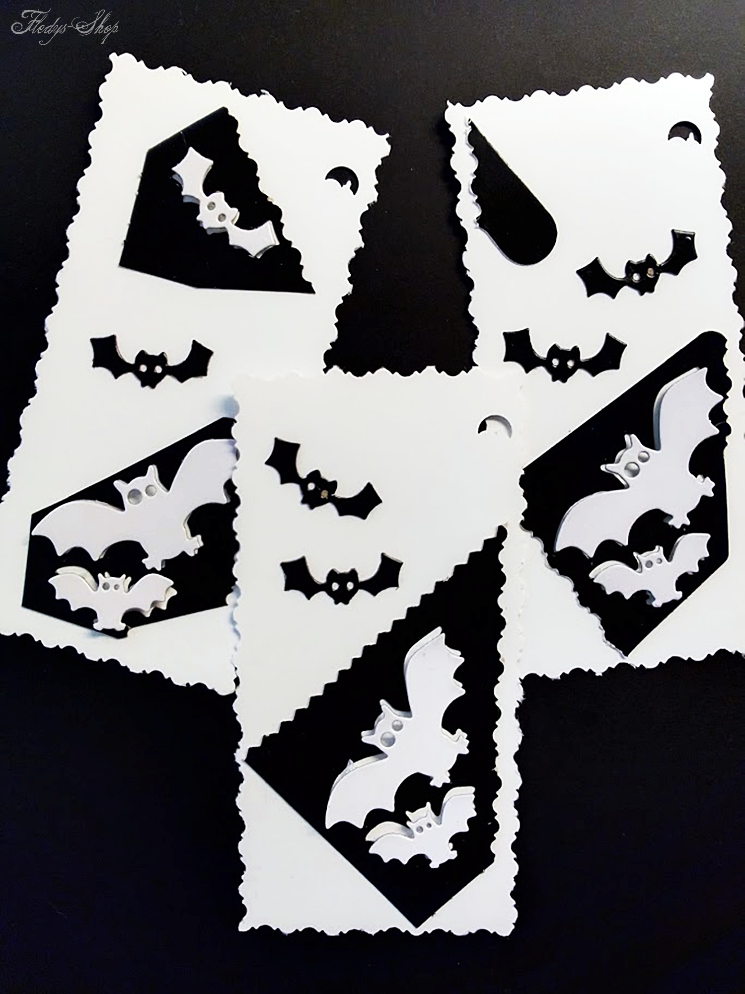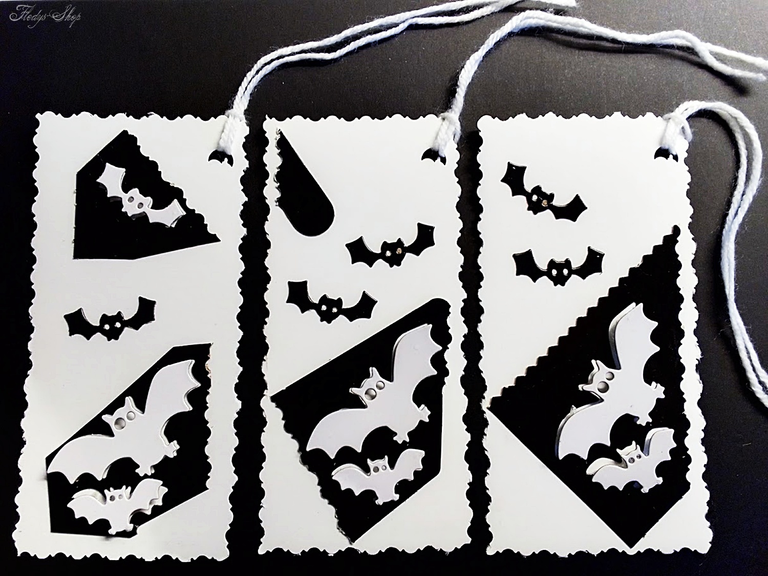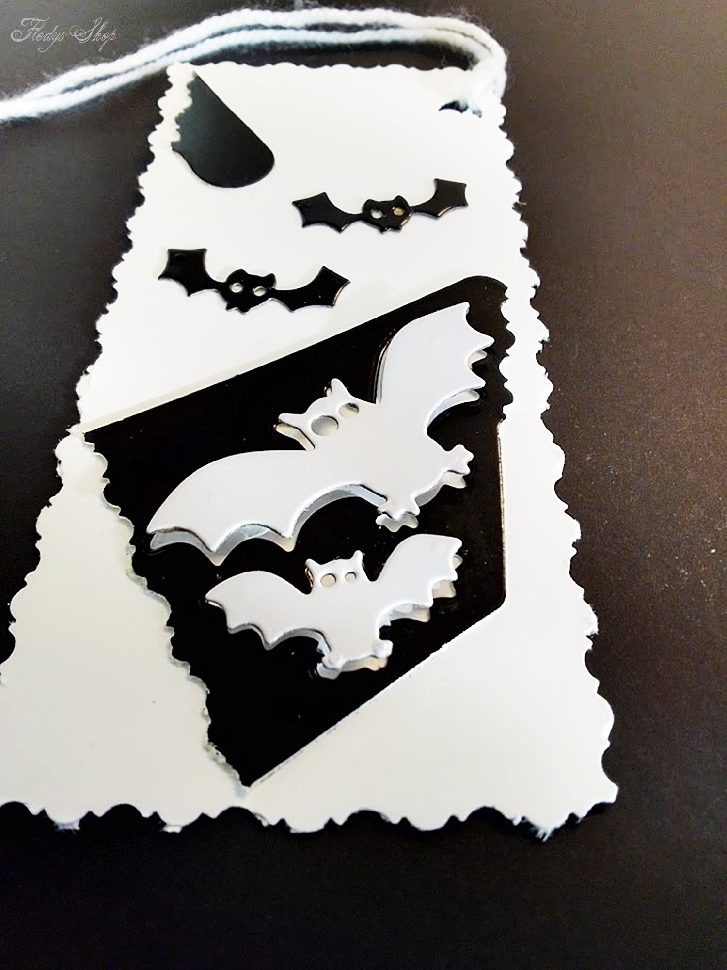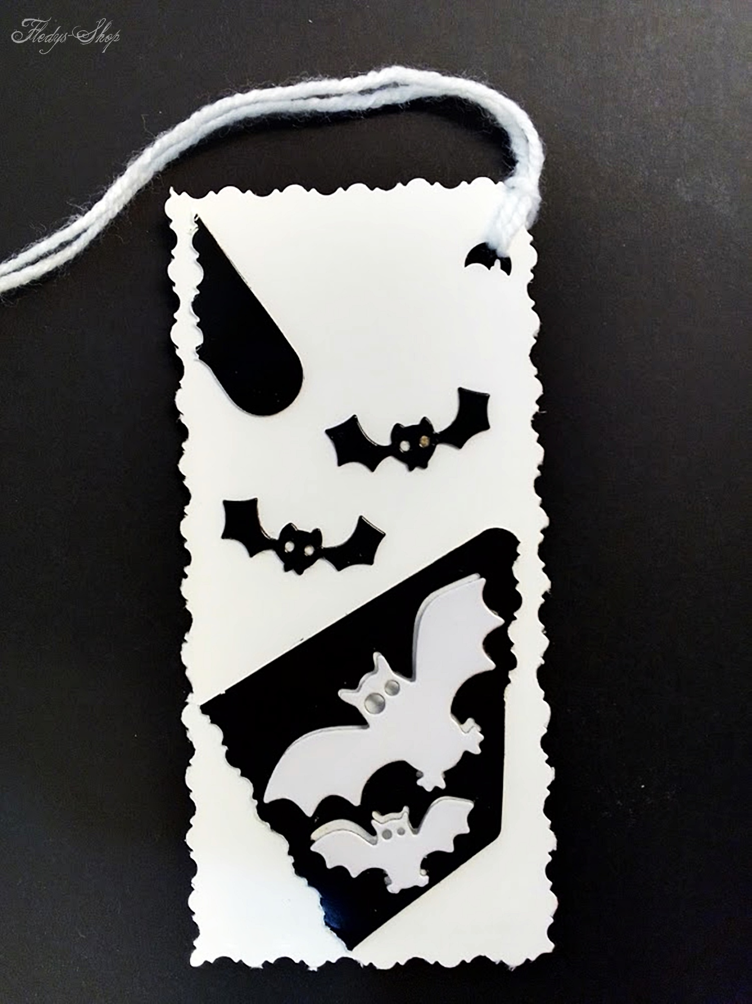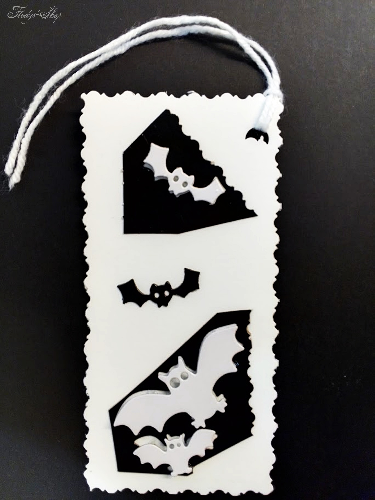 Ulkiger Geschenkanhänger in Schwarz/Weiß mit kleinen Fledermäusen. Durch seine Baumwollschnur ist dieser Geschenkanhänger schnell an Geschenken anzubringen.