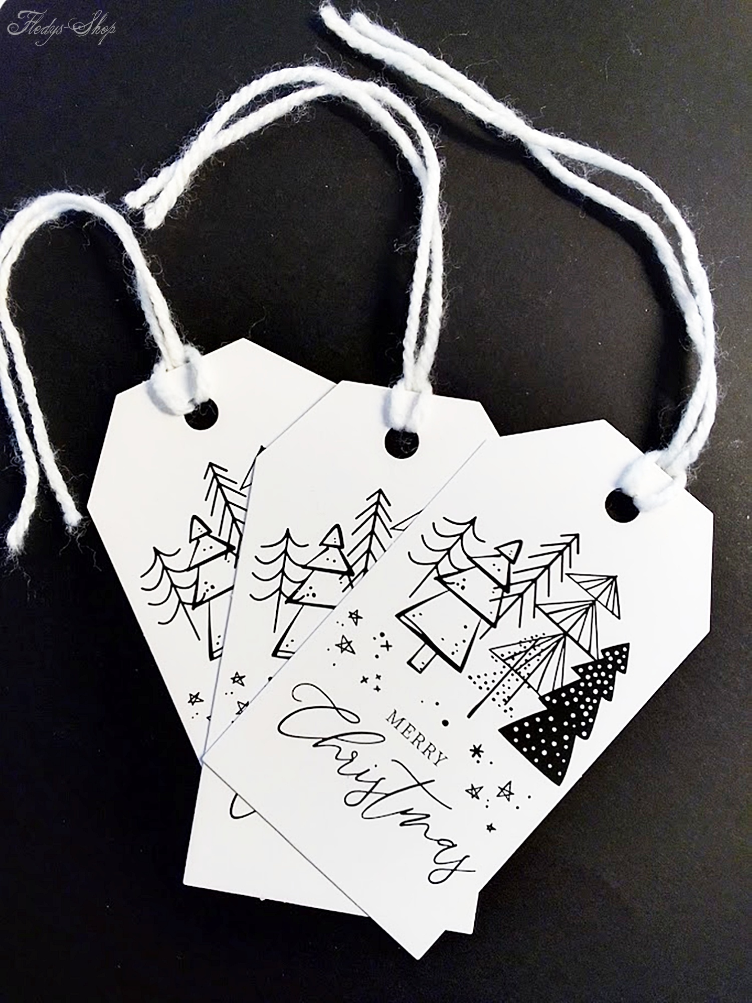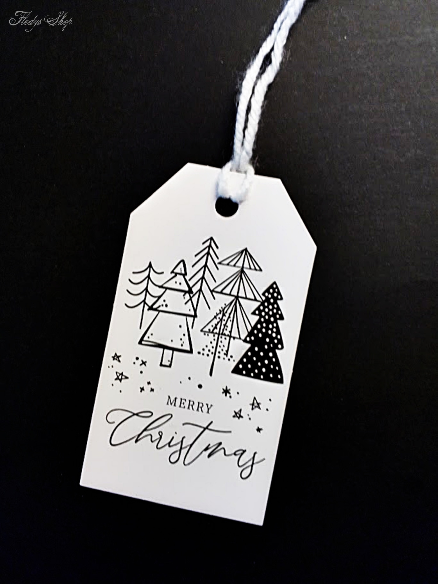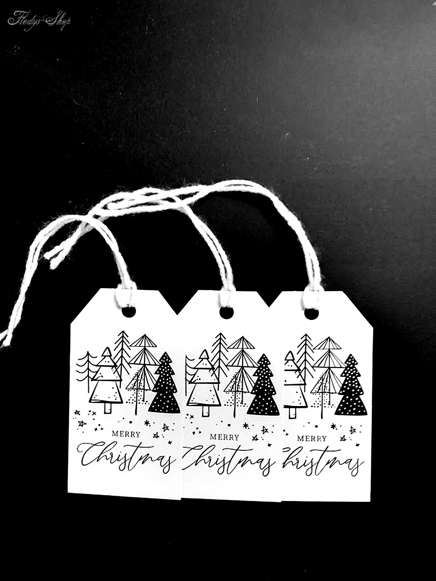 Diese 3 Geschenkanhänger mit kleinen Tannenbäumen und einem Schriftzug „Merry Christmas“ sind durch ihre Baumwollschnur fantastisch zum schnellen Anbringen an Geschenken.