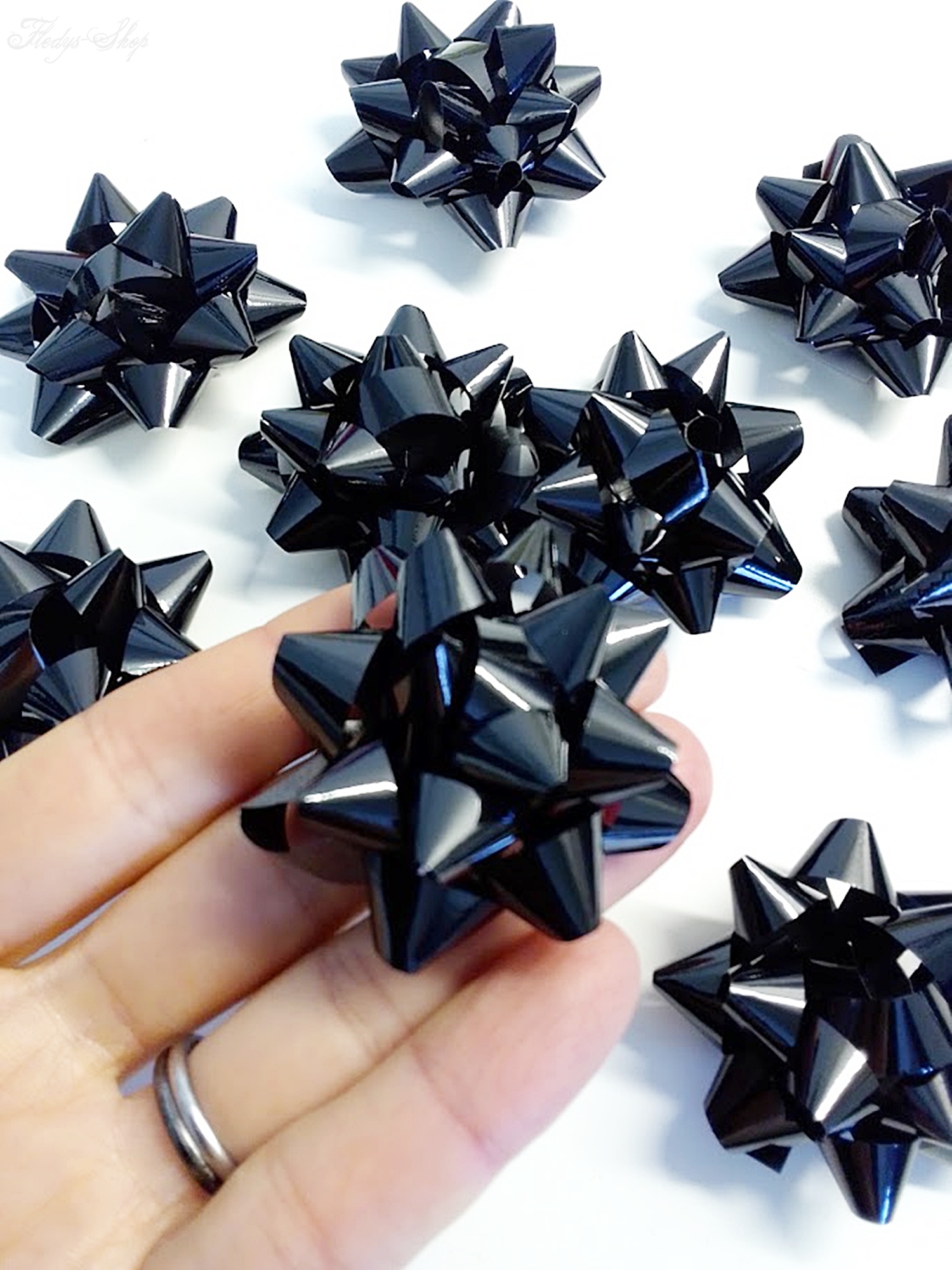 Diese wunderschönen schwarzen Geschenkschleifen mit einer Glanzoptik sind selbstklebend und sofort einsetzbar. Die Geschenkschleife kann für viele Geschenkideen, aber auch für andere Dekorationszwecke verwendet werden. Nur auf trockenen und sauberen Untergrund kleben.