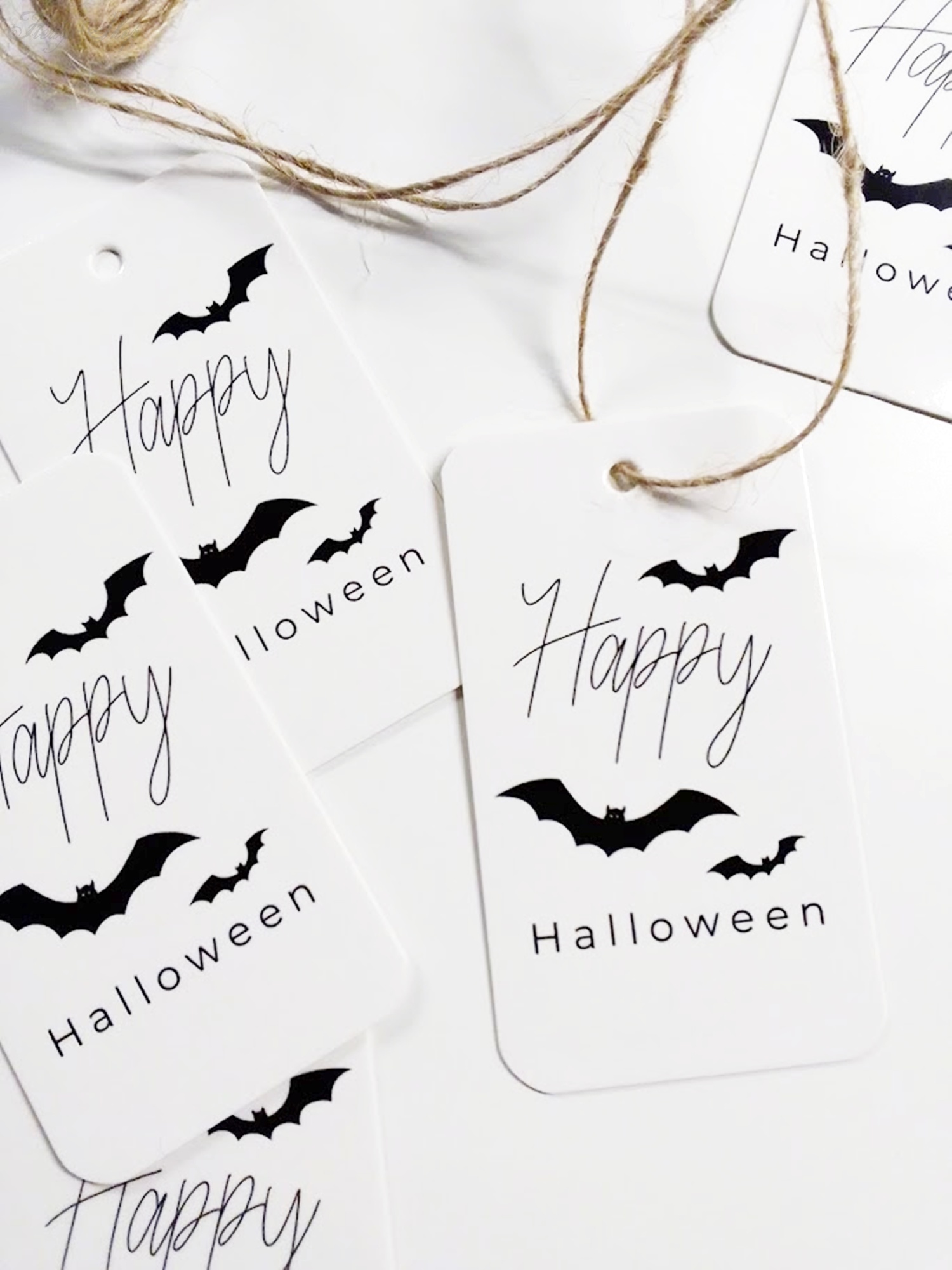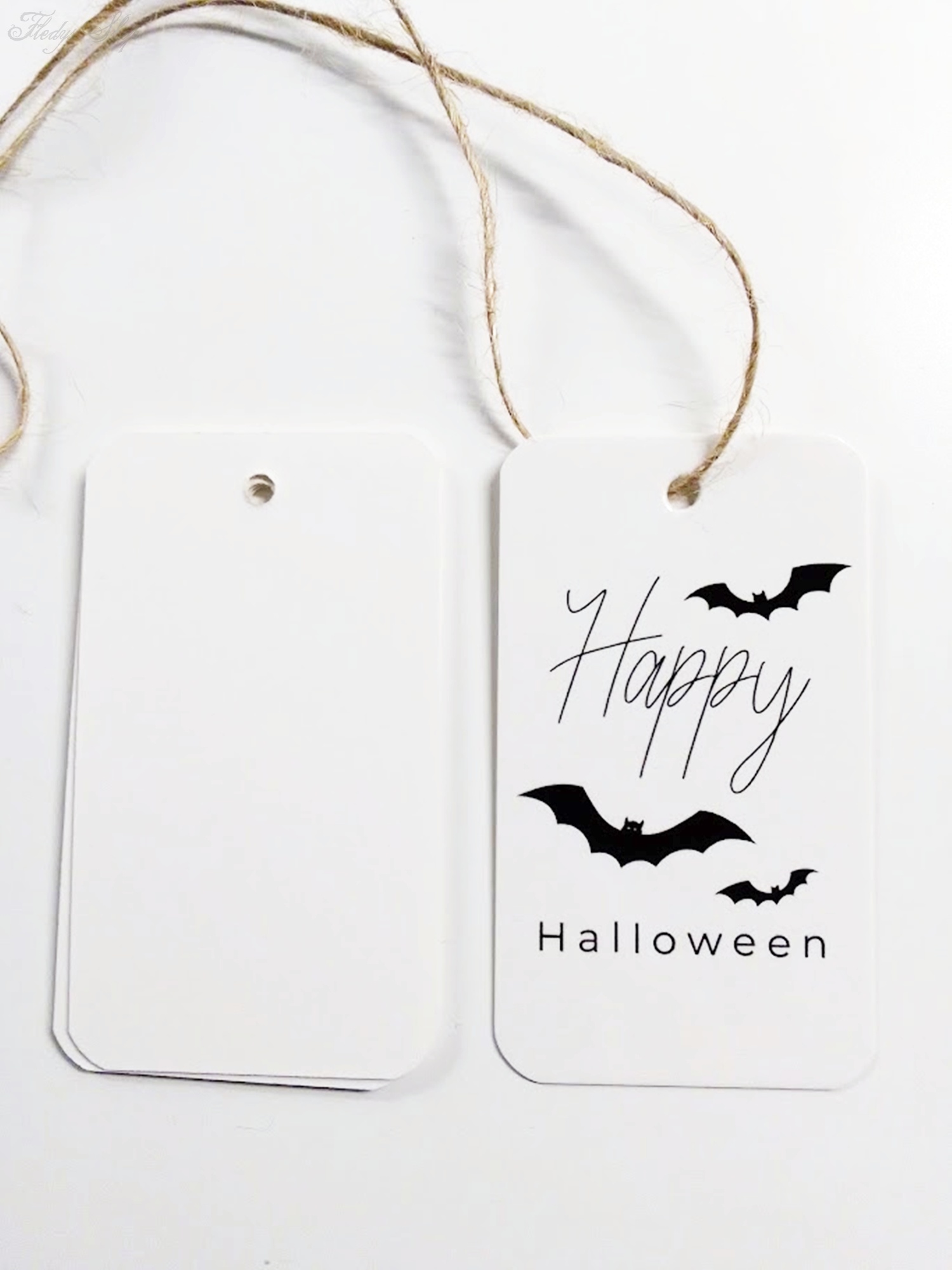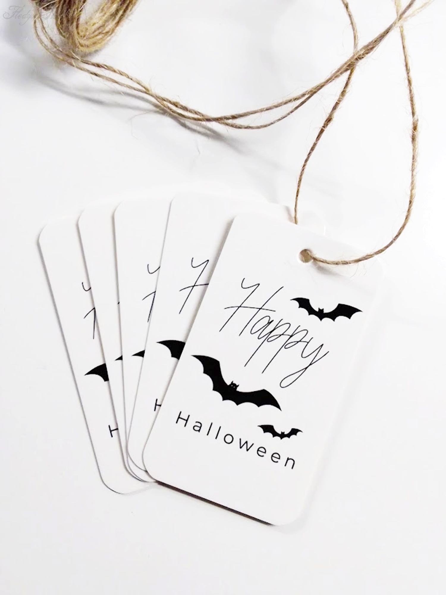 5 kleine Halloween-Geschenkanhänger, mit 3 Fledermäusen und dem Schriftzug „Happy Halloween“ bestückt. Zu jeder Karte gehört ein dünnes Juteband, sodass sie schnell beschriftet und an das jeweilige kleine Geschenk angehängt werden können.