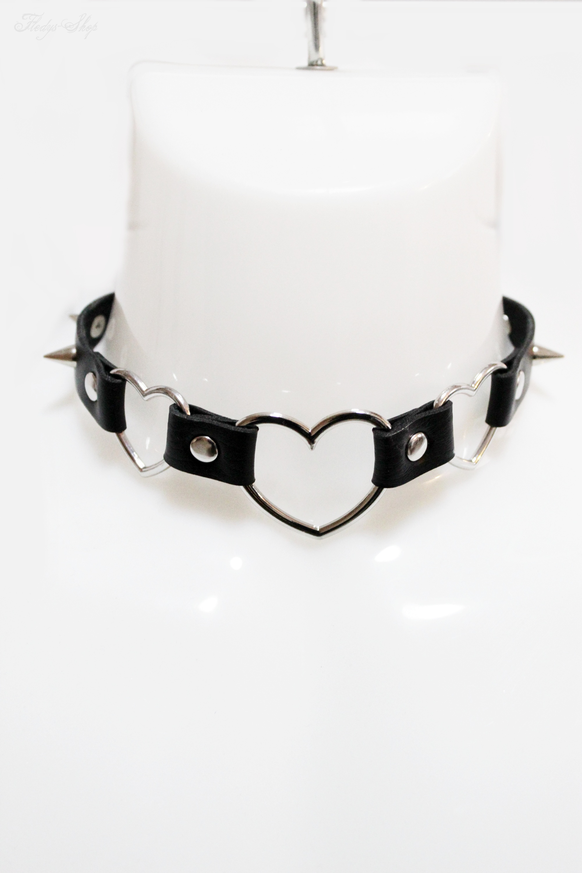 Dieses schöne Halsband, ist durch Druckknöpfe in 3 Größen im Halsumfang verstellbar. Es hat ein sehr angenehmes Tragegefühl und wird durch ein 4 cm großes Herz und 2 kleine Herzen mit ca. 3 cm geschmückt. Als weiteres Schmuckelement wurden auf jeder Seite 3 kleine Spitznieten eingearbeitet.
