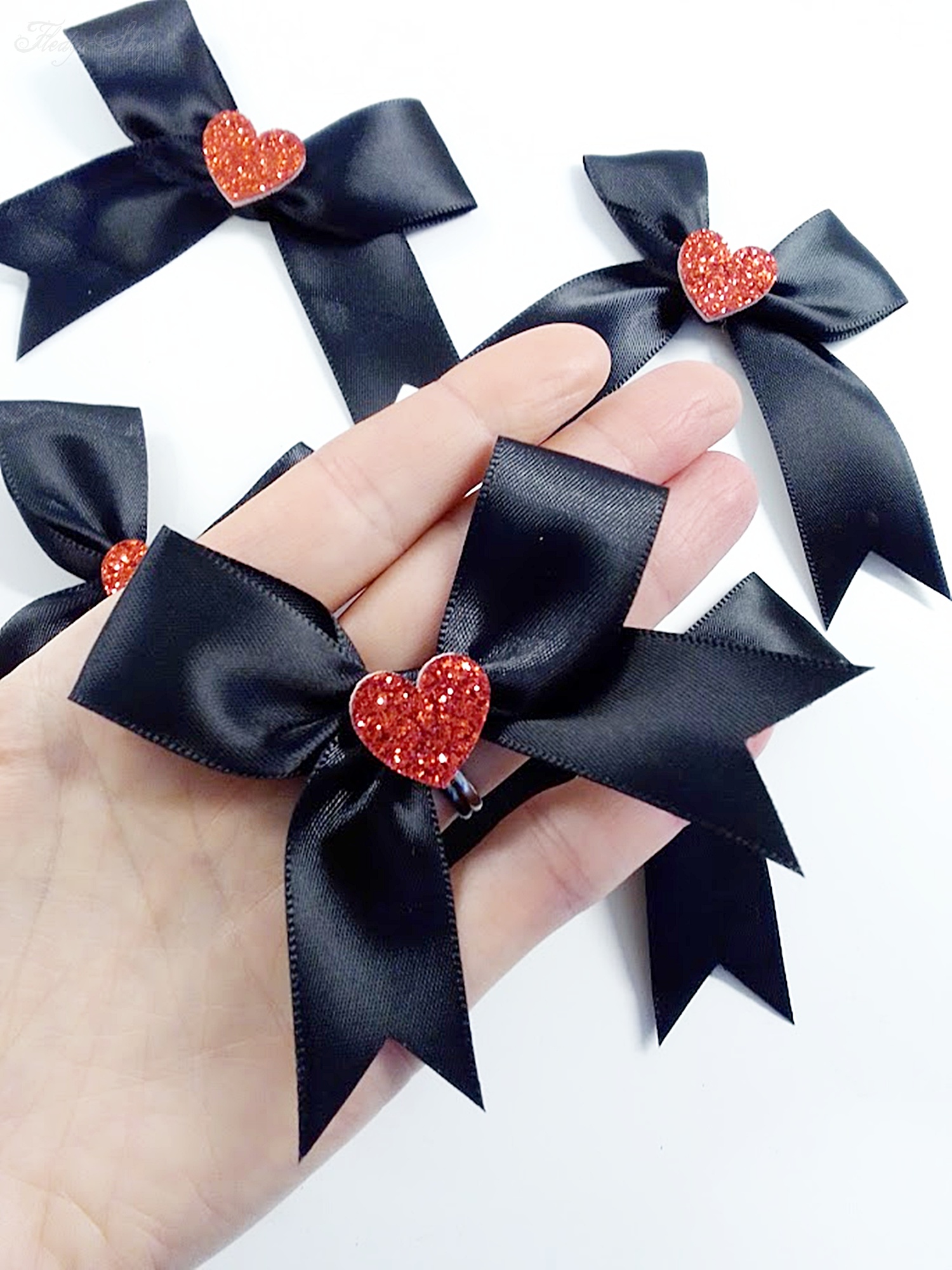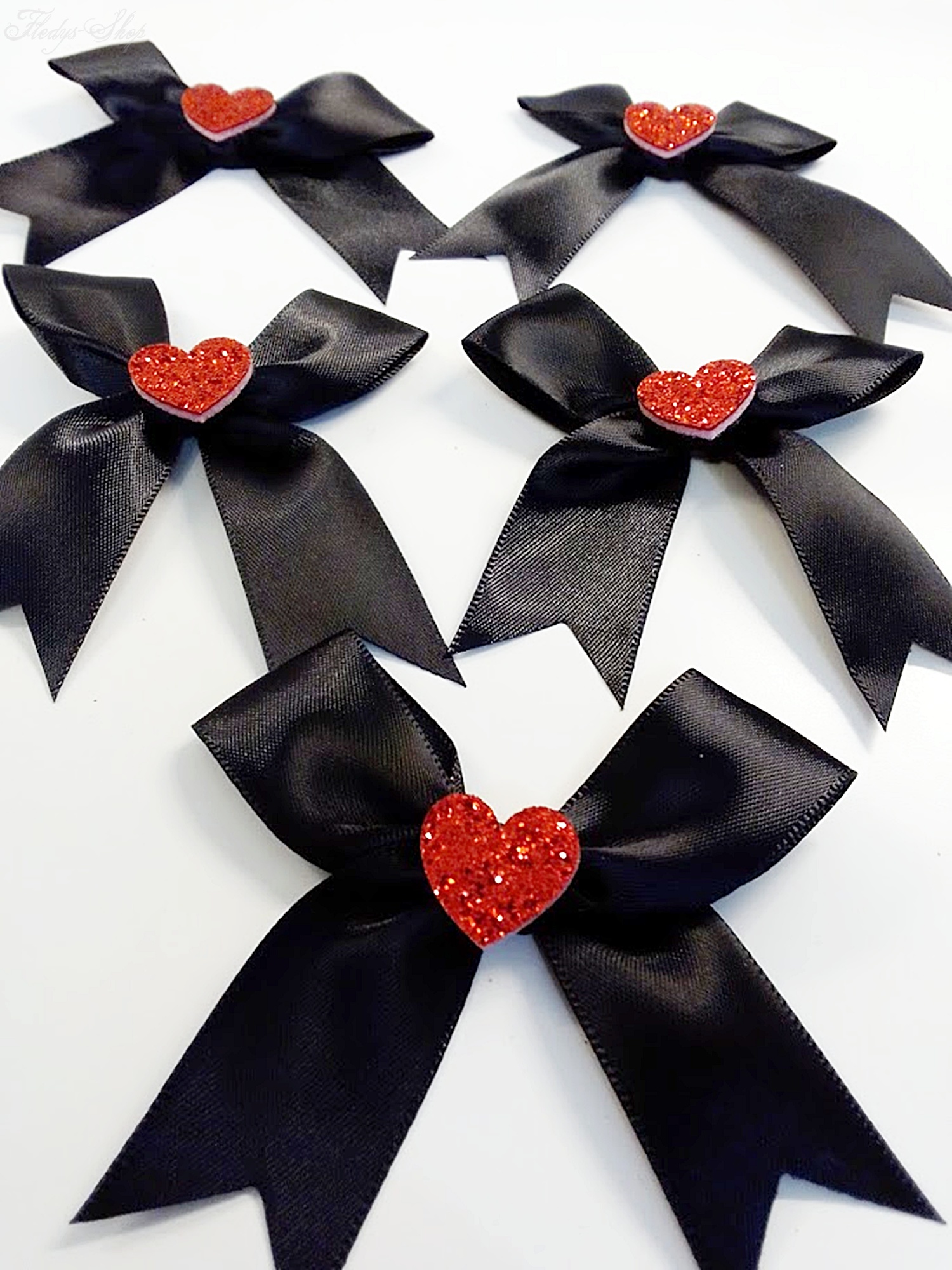 Diese wunderschöne schwarze Geschenkschleife mit einer Satinoptik, wurde mit einem glitzernden roten Herz aus Moosgummi verziert. Die Geschenkschleife kann für viele Geschenkideen, aber auch für Haarschmuck als Verzierung verwendet werden.