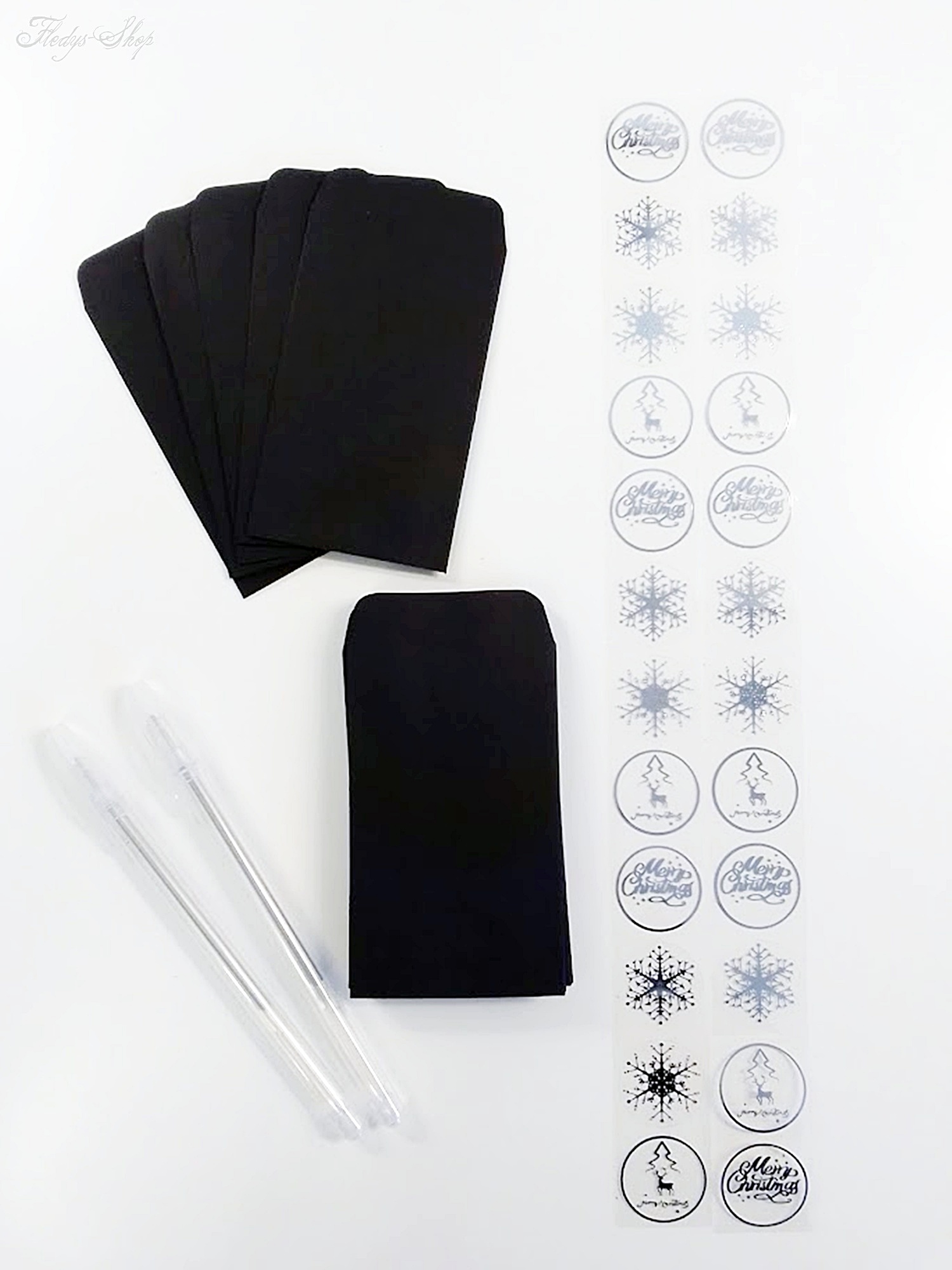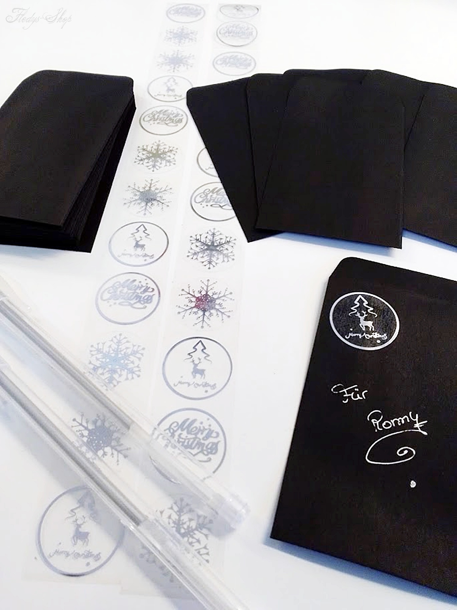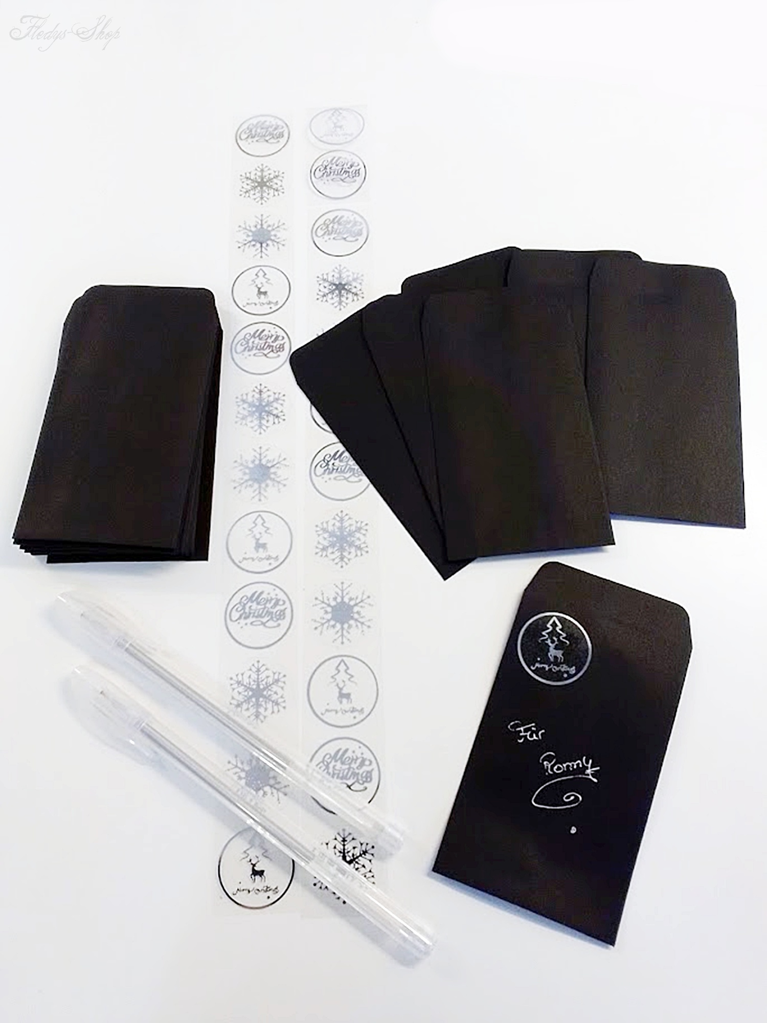 Liebevoll zusammengestelltes Weihnachtsset mit 24 schwarzen Briefumschlägen, 2 silbernen schmal schreibenden Stiften und 24 silberne Aufkleber. Dieses Weihnachtsset kann als Adventskalender oder zur weihnachtlichen Tischpräsentation genutzt werden. Wunderbar eignet es sich auch zum Anhängen an Geschenke oder für eine kleine Briefkastenbotschaft.