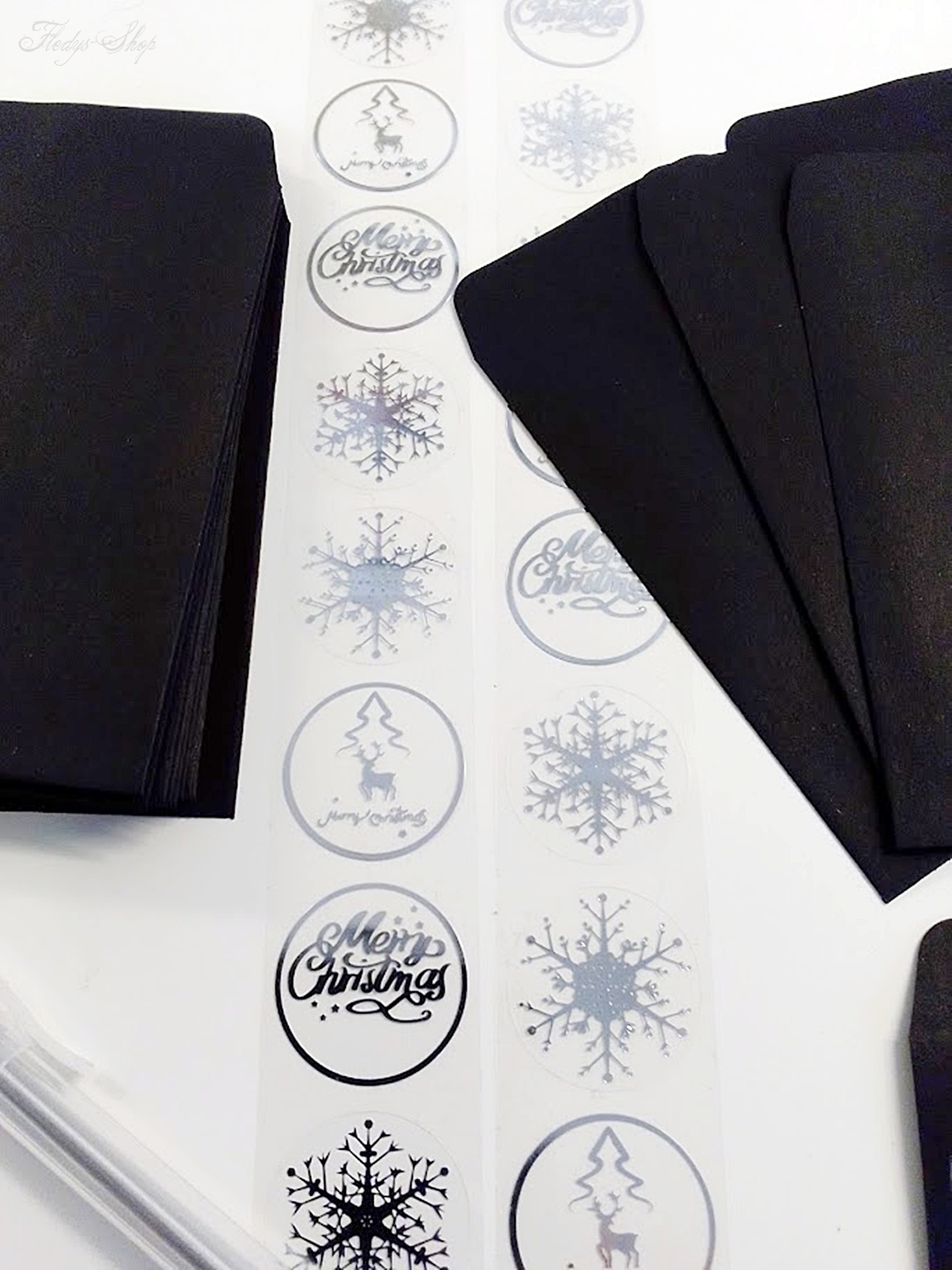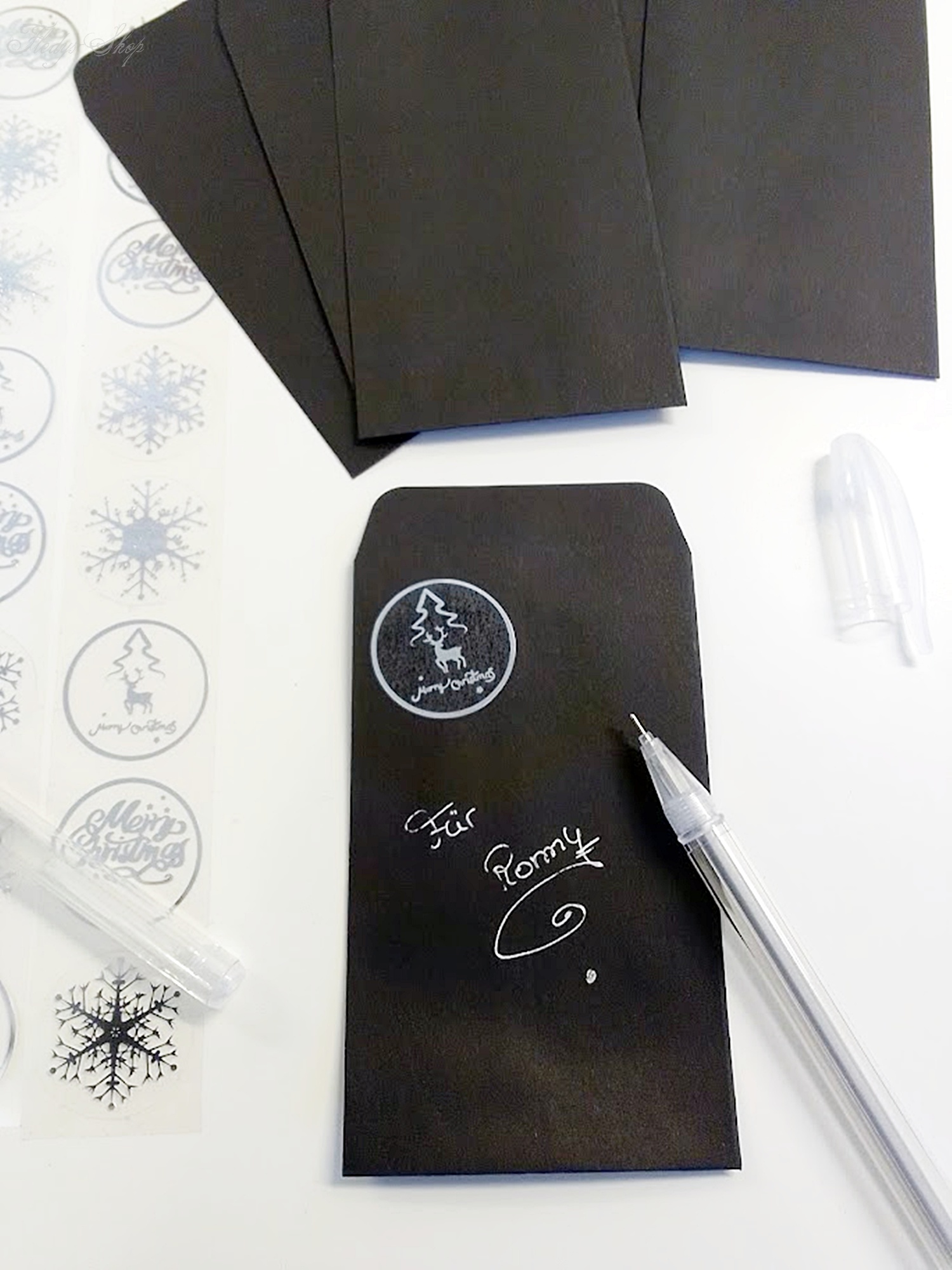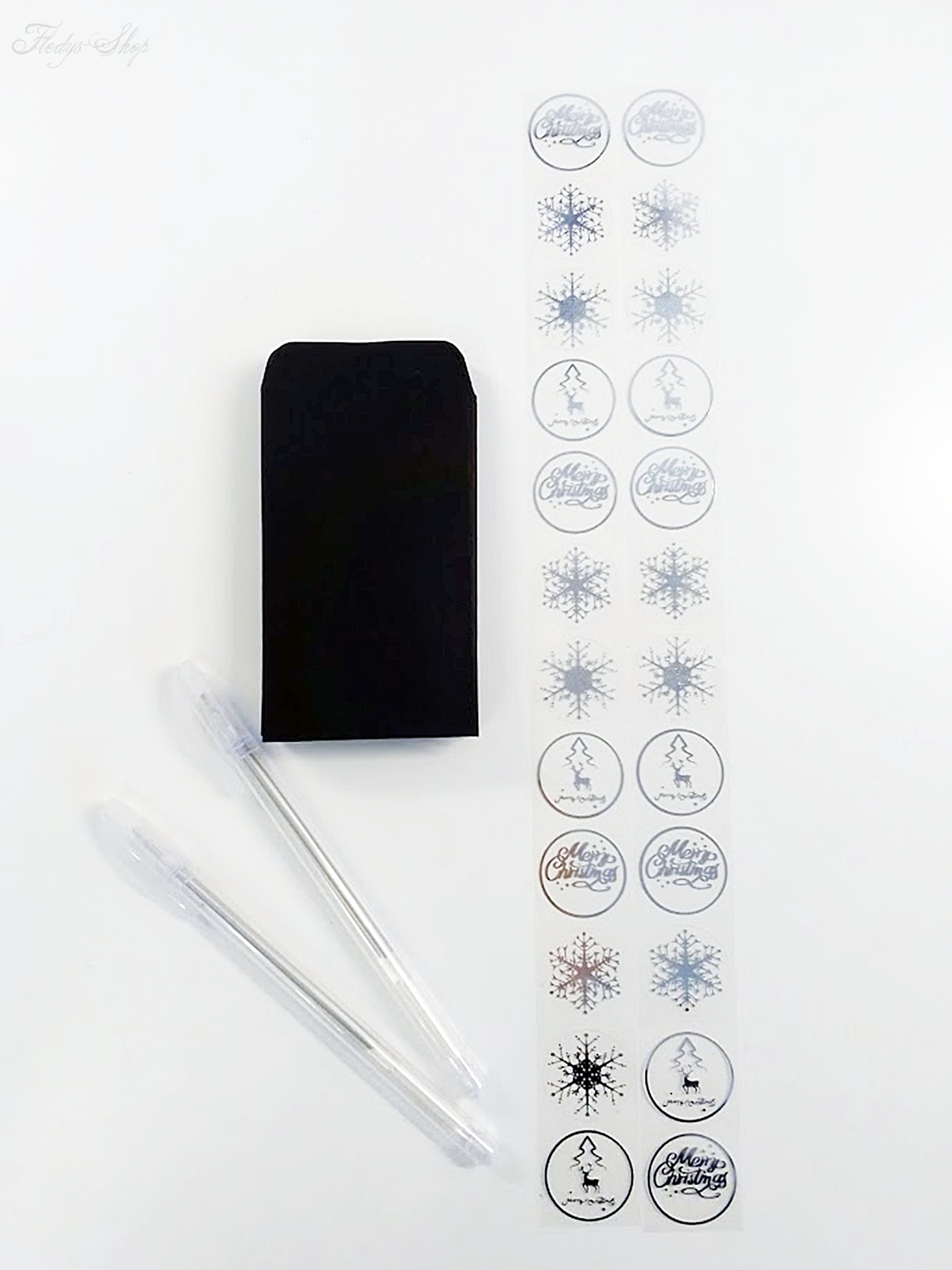 Liebevoll zusammengestelltes Weihnachtsset mit 24 schwarzen Briefumschlägen, 2 silbernen schmal schreibenden Stiften und 24 silberne Aufkleber. Dieses Weihnachtsset kann als Adventskalender oder zur weihnachtlichen Tischpräsentation genutzt werden. Wunderbar eignet es sich auch zum Anhängen an Geschenke oder für eine kleine Briefkastenbotschaft.